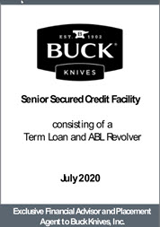 Buck Knives successfully raised new debt proceeds in partnership with a new finance partner sufficient to fully repay its existing debt, provide capital to fund current growth initiatives and to reposition the business to capitalize on future growth opportunities.